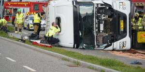 Kaos i morgentrafikken: Lastbil vælter på Aarhus havn