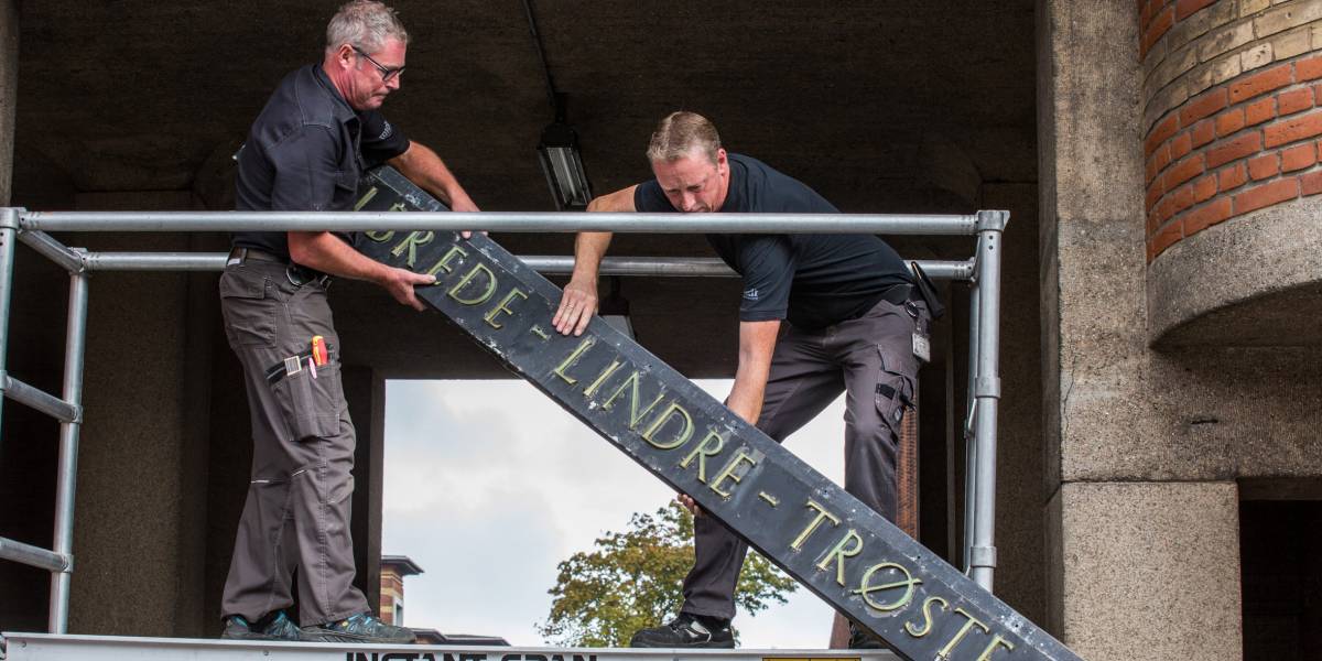 Flere hundrede nuværende og tidligere medarbejdere på Aarhus Universitetshospital, Tage-Hansens Gade tog i dag afsked med de smukke, røde bygninger, der i mere end 80 år har været hospital for aarhusianerne. Markeringen skete ved hospitalsporten, hvor det ikoniske hospitalsskilt: "Helbrede, Lindre, Trøste" blev taget ned. Skiltet bliver bragt til Skejby, hvor det skal hænges op i de nye omgivelser.