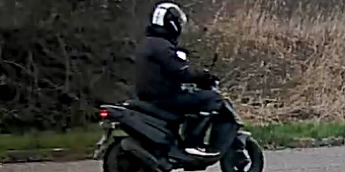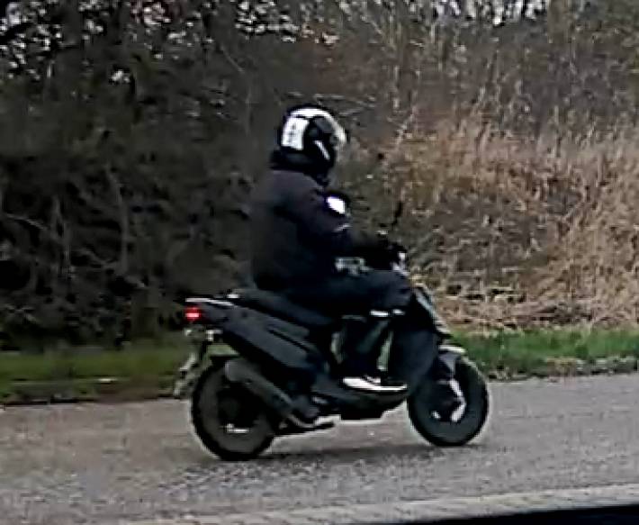 Sort scooter med tændt baglys på gerningstidspunktet, to sidespejle og muligt sort/hvid fælg på forhjul